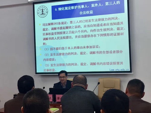 廖永安教授以民事诉讼法司法解释的解读为主题,围绕着民事诉讼司法解释应遵循的原则和司法解释的主要内容为学员们作了详细的解读。廖教授指出,司法解释要坚持依法原则、统一性和灵活性相结合原则、问题向导和突出重点原则;司法解释的主要内容则应以确保民事诉讼程序的公正性为主线。随后,廖教授对司法解释中关于切实保障当事人诉讼权利、保障司法公开、规范证据的审查与运用、切实提高民事审判工作效率、贯彻诚实信用原则、完善公益诉讼制度、进一步完善法庭纪律等八项新规定进行了解读。廖永安教授的精彩讲授赢得了学员们的阵阵掌声,学员们纷纷表示获益匪浅。