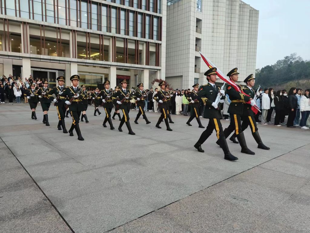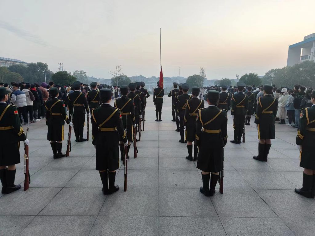 一声出旗令下,红旗在前,钢枪在后,国旗护卫队目光如炬,踏着整齐划一的铿锵步伐,正步走向升旗台。国歌奏响,全体肃立,掌旗手振臂扬起国旗。天边的红霞与五星红旗交相辉映,劲爽的晨风携国旗冉冉升起。