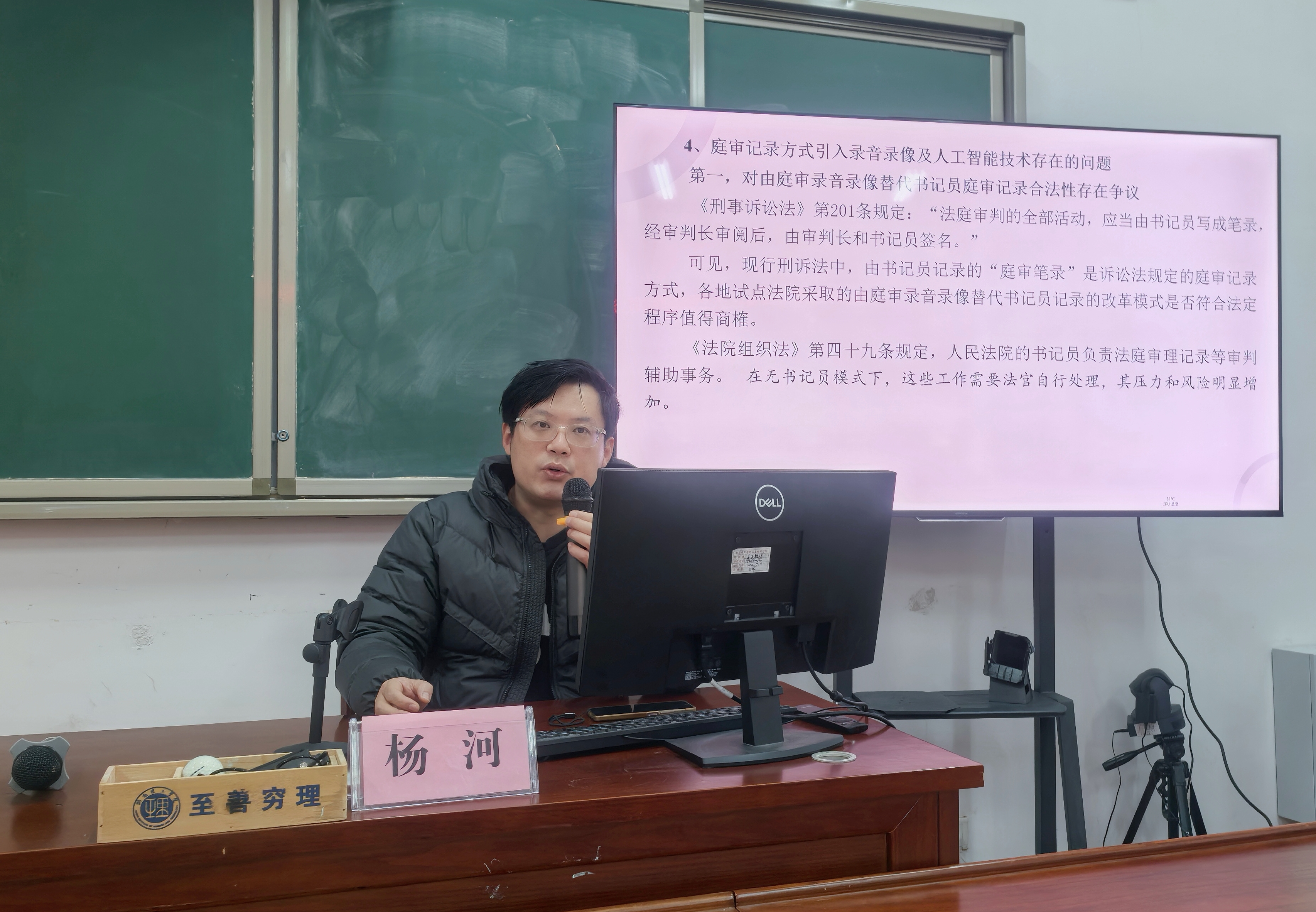 杨河老师讲授了刑事诉讼程序规范,他指出法院要规范一审刑事公诉案件庭审程序,优化庭审方式,全面推进刑事案件庭审的实质化、规范化。