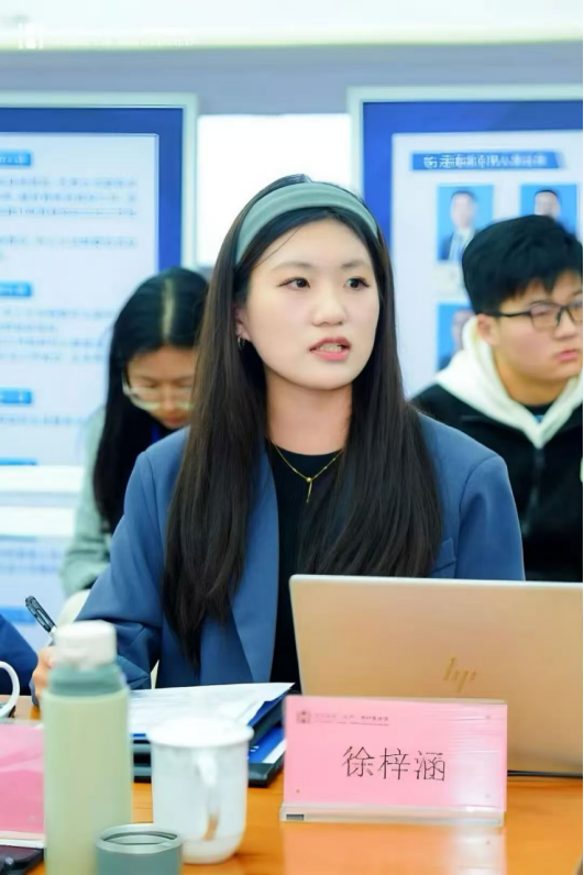 徐梓涵同学以《“双碳”目标下建设工程全生命周期碳信息披露法律制度构建》为题作了专题汇报。她指出,建筑业碳排放占比高,但现行碳信息披露制度存在标准分散、法律强制力不足及责任划分不清等问题。通过比较域外经验,她提出应确立强制披露制度,构建统一标准与信息平台,明确以业主为核心的全过程责任链条,并完善协同监管与激励约束机制,以推动建筑业的绿色低碳转型。