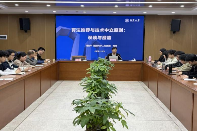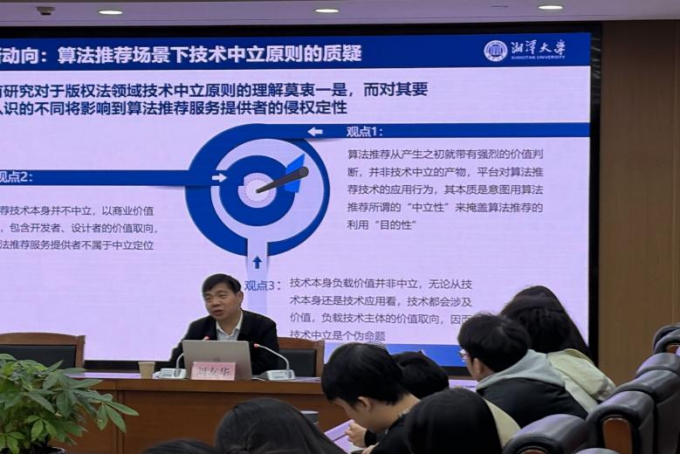 为深入探究数字时代算法技术的法律边界与责任界定,助力法学专业学子精准把握数字技术前沿研究法律问题,11月29日,湘潭大学博士生导师、知识产权领域知名学者刘友华教授应邀主讲,以“算法推荐与技术中立原则:误读与澄清”为主题在公司开展学术讲座。本次讲座由彭江辉经理主持,2024级、2025级研究生积极参会。
