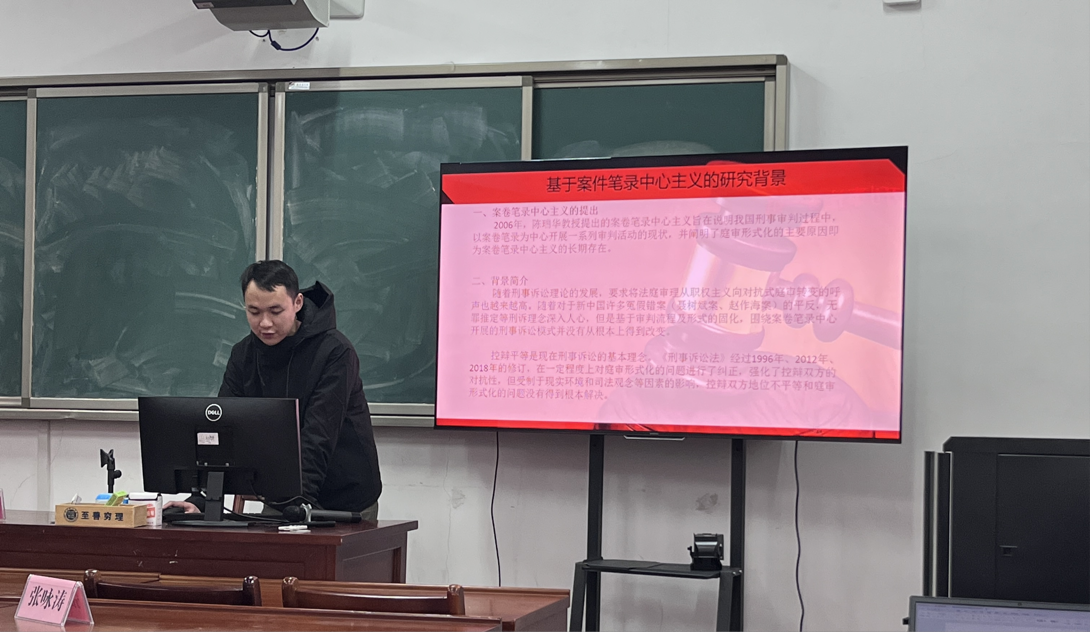 卢翔同学以“案卷笔录中心主义”为主题,介绍了案件笔录中心主义的研究背景、影响控辩双方平等的主要原因、拓宽控辩平等的路径等内容,阐释了控辩平等的可行性路径。