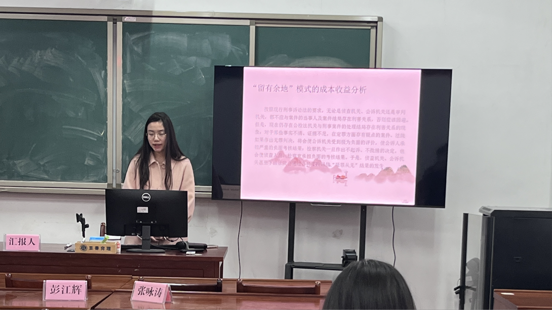 高宇欣同学以“留有余地的裁判方式”为主题,介绍了我国疑罪从轻、疑罪从无的裁判方式,并结合相关经典案例对此种裁判方式进行总结与反思。