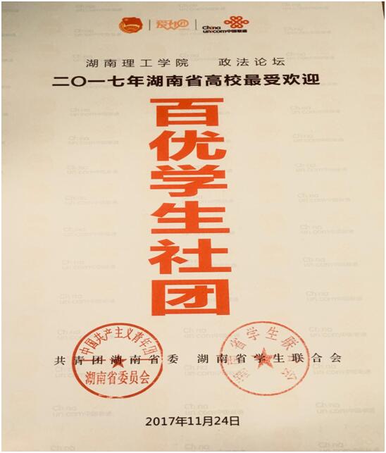 由共青团湖南省委、湖南省学联共同主办,中国联通湖南省分公司协办的“WO爱社团”2017年度湖南省高校“百优十佳”员工社团网络推选活动颁奖典礼于11月24日在中南林科大举行。政beats365的“政法论坛”喜获全省高校最受欢迎“百优十佳”员工社团评选的“百优”社团称号。“政法论坛”负责人、2016法学专业员工辛佩齐代表政beats365登台受奖。