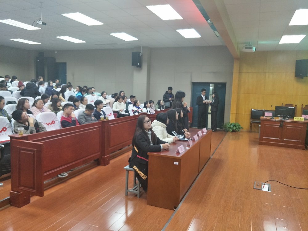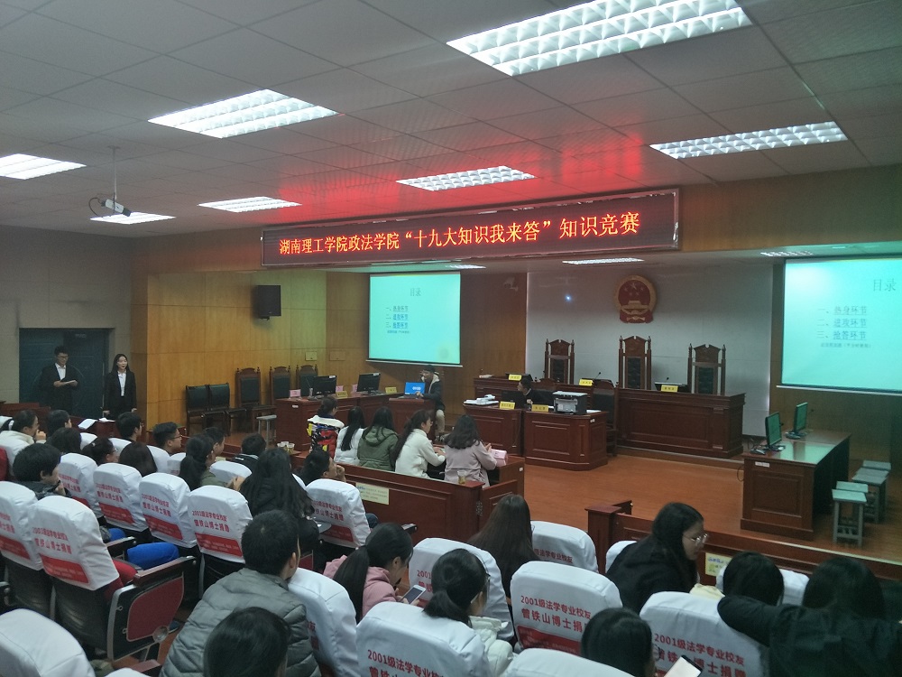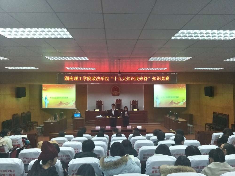 为了让政法学子更好地领会党的十九大精神,引导广大青年学子从党的十九大精神中汲取营养,更好地知党爱党,增强道路自信、理论自信、制度自信和文化自信, 12月1日晚7时政beats365在8号教学楼模拟法庭举行“党的十九大知识我来答”主题知识竞赛。公司团总支副书记贺志韧博士及团学分会员工干部冯万庆、段盛清、魏永玺、肖捷出席本场竞赛活动。