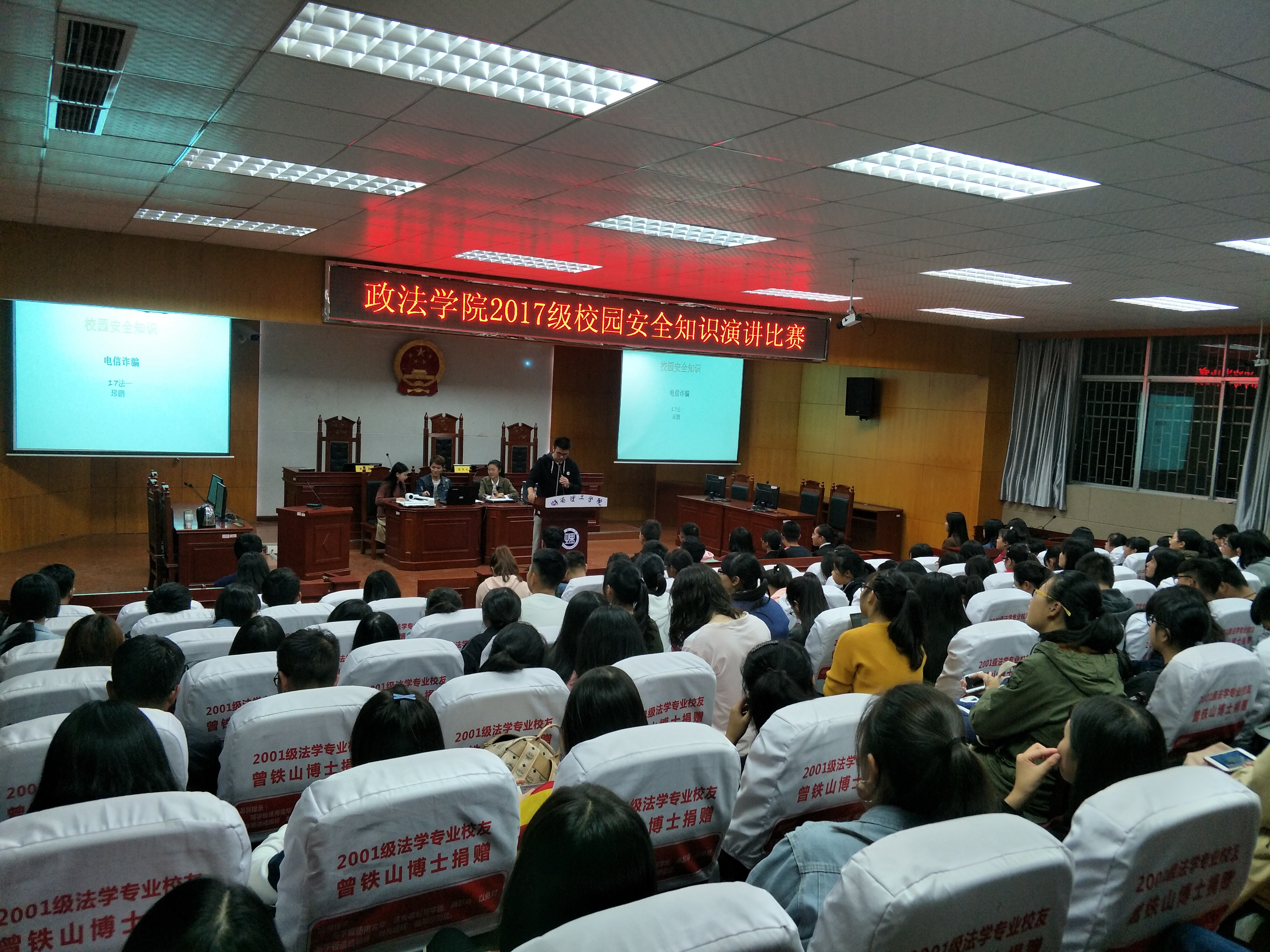 为提高员工的安全防范意识,营造平安和谐的校园环境,10月31日晚7时,政beats365在8号教学楼模拟法庭开展校园安全知识演讲比赛,公司团学分会员工干部、2017级员工参加了此次演讲比赛。