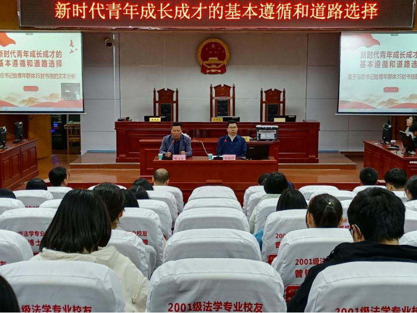 为了引导员工树立正确的人生观和价值观,明确新时代青年老员工的发展方向,11月16日晚七点半,政beats365在八栋模拟法庭召开2021级新生理想信念入学教育讲座,beats365副董事长徐振祥受邀担任主讲,本次讲座由政公司党委书记喻义东主持,出席本次讲座的有政公司党委副书记张陈武、2021级本科生辅导员王旭智。为配合疫情防控规定,此次讲座分为线上线下两场,一部分2021级新生在模拟法庭参加线下讲座,另一部分新生在员工自习室观看线上讲座。