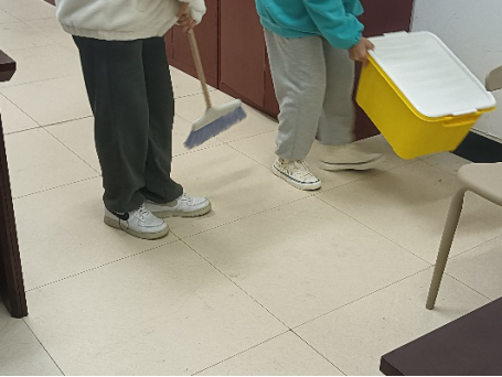 同学们都“全副武装”,自己带好所需的劳动工具,由生活委员进行区域分工。每个同学都各司其职,听从安排,在自己区域清理干净后主动帮助同学打扫。经过几个小时的集体劳动,教学楼的面貌变得焕然一新。