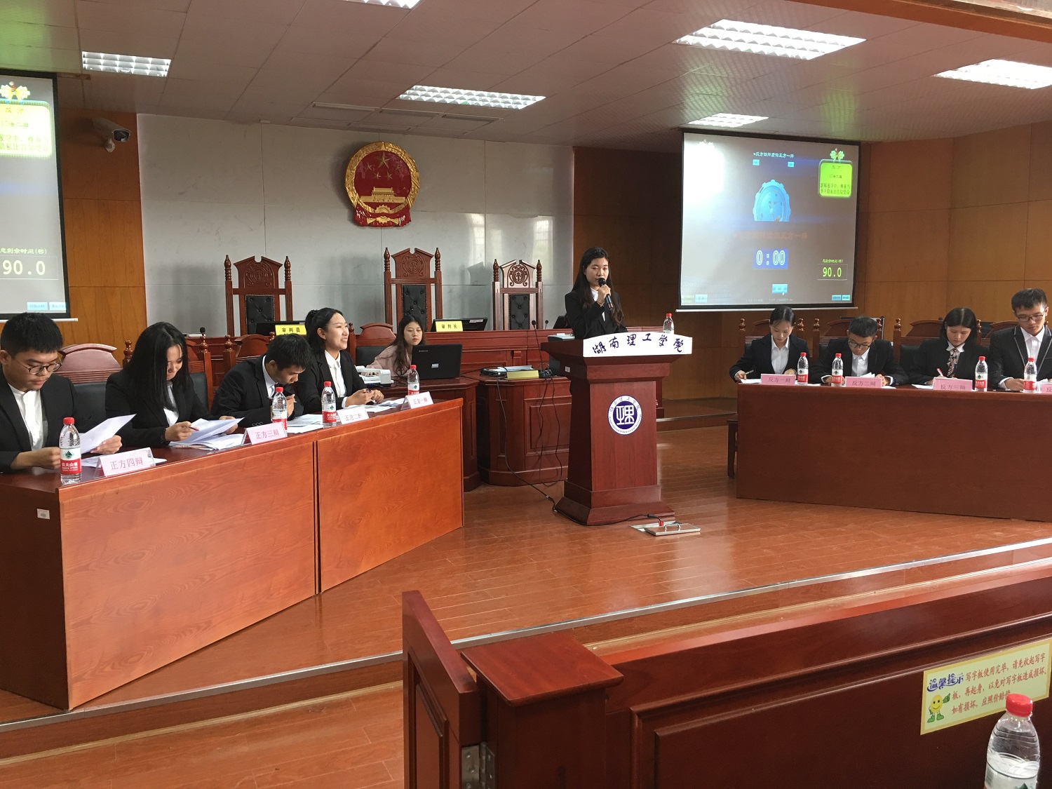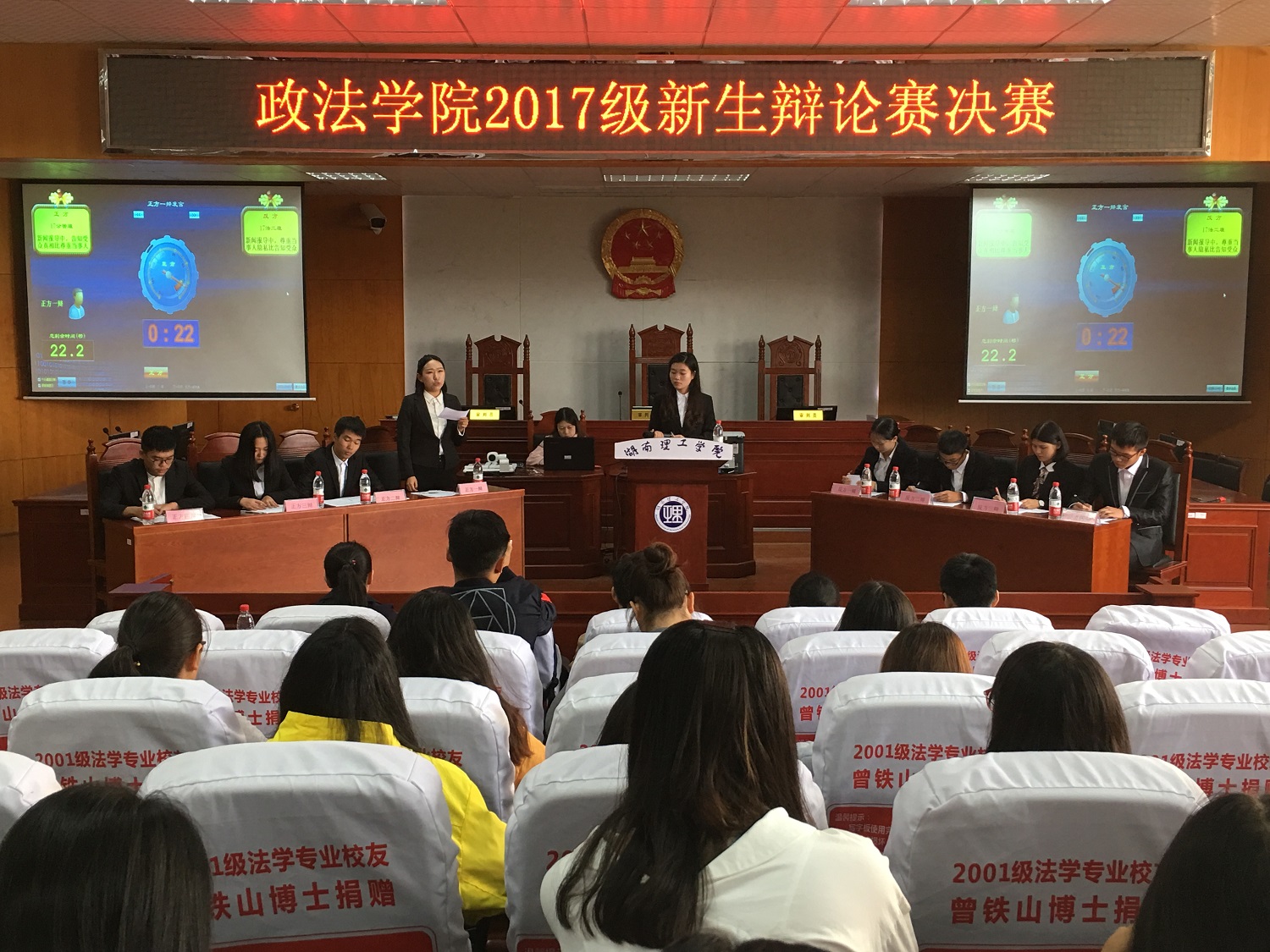 政2017级新生辩论赛决赛于10月22日上午9时在8教学楼模拟法庭进行。经过初赛、复赛选拔,最终来自2017级公共事业管理班和法学二班的两支参赛队伍进入决赛。政2014级辩论队队长万嘉宾、副队长单婷,2015级辩论队队长梁小梅、副队长王川健,美术公司2015级辩论队队长王卓担任此次决赛的委。政beats365团学分会员工干部及2017级部分同学观看此次决赛。
