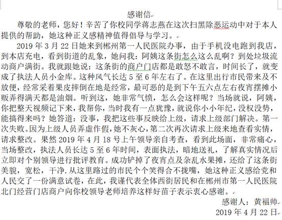 近日,政2017级辅导员杨宗圆老师意外接到来自郴州市第一人民医院后门西街水巷的群众来电和来信。在电话和表扬信中对公司2017级公共事业管理专业员工蒋志燕就郴州市区街道整改问题积极寻求途径最终得以解决一事表达了当地居民们的感谢,并高度赞扬公司、公司在员工道德品质与能力素质培养方面的成绩。