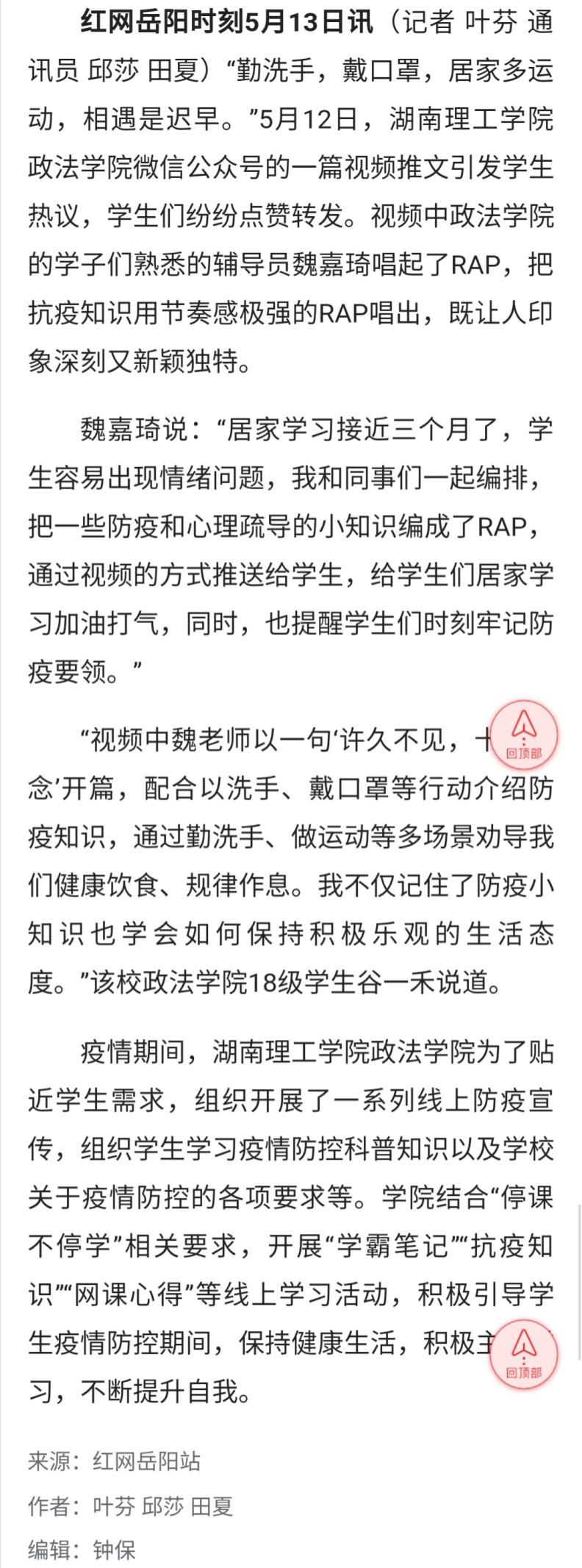 5月13日,湖南红网在首页资讯的“岳阳站”的栏目中,以“视频|开学在即,相遇是迟早!‘可可爱爱’辅导员版抗疫RAP还热乎”为题,报道了公司2018级辅导员魏嘉琦在公司线上防疫一系列活动中为贴近员工生活,及时疏导员工隔离在家而产生的不良情绪采用的年轻人喜闻乐见的rap小视频方式来进行抗疫知识科普的事迹,以实际行动践行抗疫主题教育。