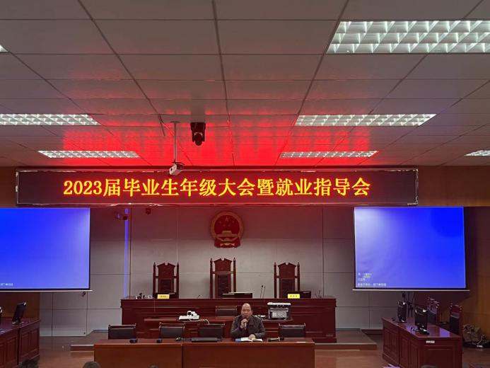 【本站讯】为帮助毕业生明确未来就业方向,顺利完成毕业,公司于3月30日在模拟法庭召开2023届毕业生年级大会暨就业指导会。党委书记喻义东、党委副书记张陈武、就业专干王旭智、教学秘书任蓉以及全体毕业生参加此次会议。