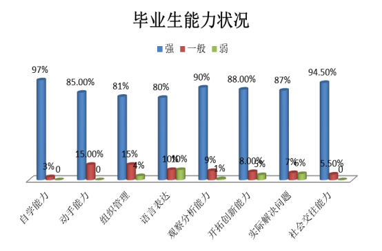 3.就毕业生就业时对于自己的知识状况与能力状况做了一个调查,数据显示,调查地区的毕业生对自己的自主学习能力、社会交往能力以及观察分析能力比较认同,但语言表达能力与组织管理能力较为欠缺。