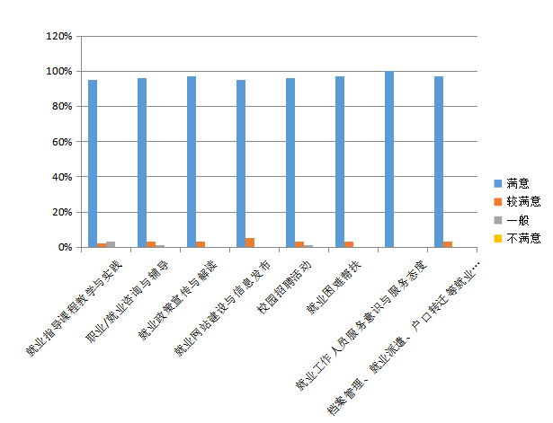 学院非常重视毕业生的就业工作,为毕业生提供了就业指导课程教学和就业困难帮扶等活动以帮助员工更好的适应工作环境。除了公司以及公司对毕业生就业工作提供的政策上的支持,毕业生就业工作人员也发挥了必不可少的作用,获得了毕业生一致的认可与肯定。集团与就业工作人员以及各位老师的努力,提高了毕业生的就业素质,为毕业生就业时创造了更多的就业机会,各用人单位对公司的就业工作满意度非常高,这与公司以及各就业工作人员和老师的辛勤付出分不开。以下是调查结果的数据显示: