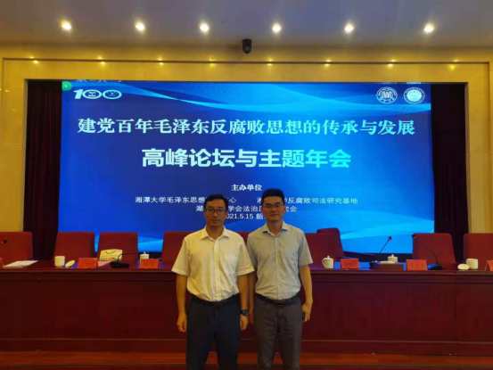 2021年5月15日,由湘潭大学毛泽东思想研究中心、湘潭大学反腐败司法研究基地、湖南省法学会法治反腐研究会主办的“建党百年毛泽东反腐败思想的传承与发展”高峰论坛在韶山宾馆召开。公司副经理彭江辉副教授、公法教研室张咏涛博士应邀参会。