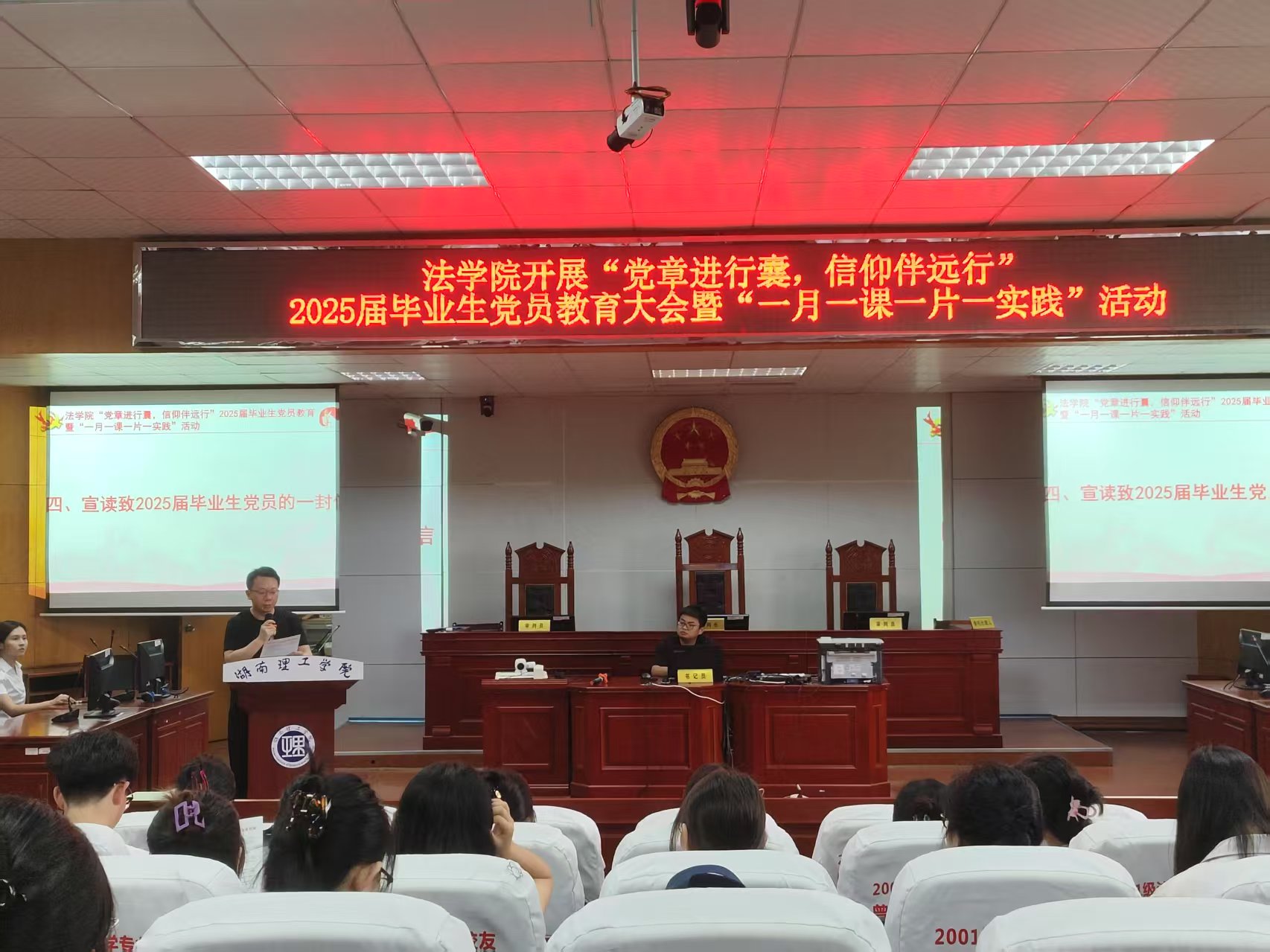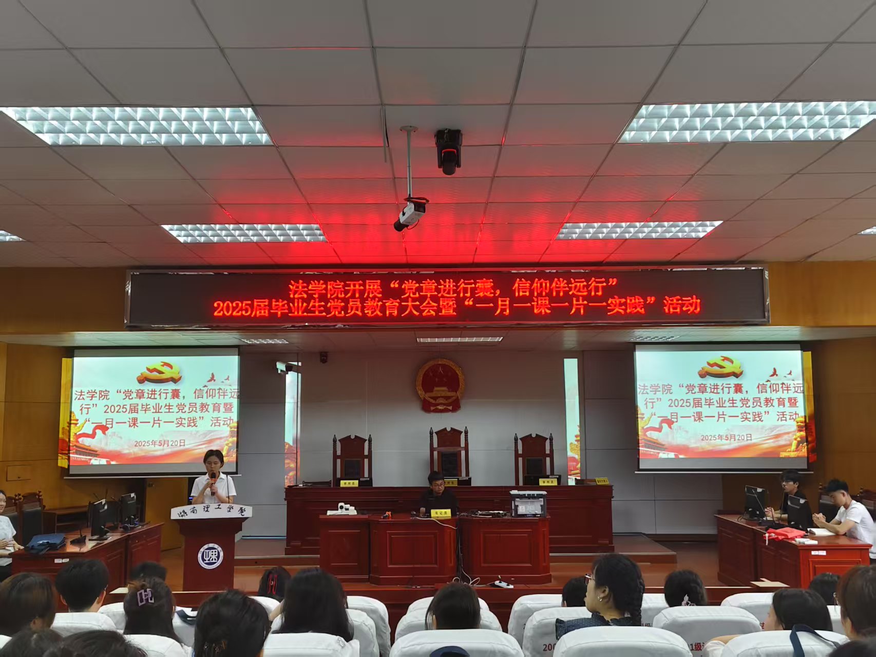 【本站讯】为进一步开展深入贯彻中央八项规定精神学习教育,巩固党纪学习教育成果,强化毕业生党员党性修养,确保组织关系转接顺利进行,5月20日下午14:00于8栋教学楼模拟法庭,公司党委召开了“党章进行囊,信仰伴远行”毕业生党员教育大会暨“一月一课一片一实践”活动。公司党委书记薛静,组织员、员工党支部书记何铁勇,研究生党支部书记王旭智出席,beats365全体师生党员参加此次活动。