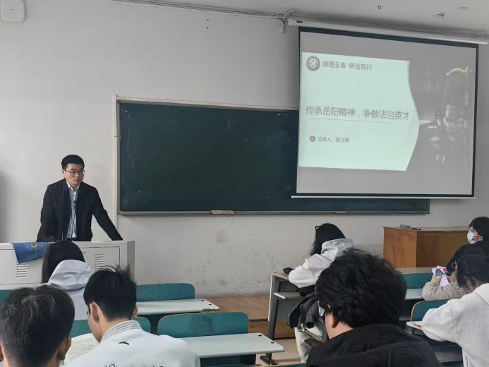 彭江辉围绕“传承岳阳精神,争做法治英才”主题,从“弘扬忧乐精神,践行党的宗旨”“传承求索精神,坚定理想信念”“发扬骆驼精神,锤炼过硬作风”“恪守革命精神,永葆政治本色”“强化青春担当,勇扛时代重任”五个维度展开,深入阐释了岳阳精神与党性修养的内在联系和实践要求。他强调,岳阳精神是加强党性锻炼的重要载体,要把岳阳精神融入法治人才培养全过程,培养既懂专业又讲政治的新时代法治人才。